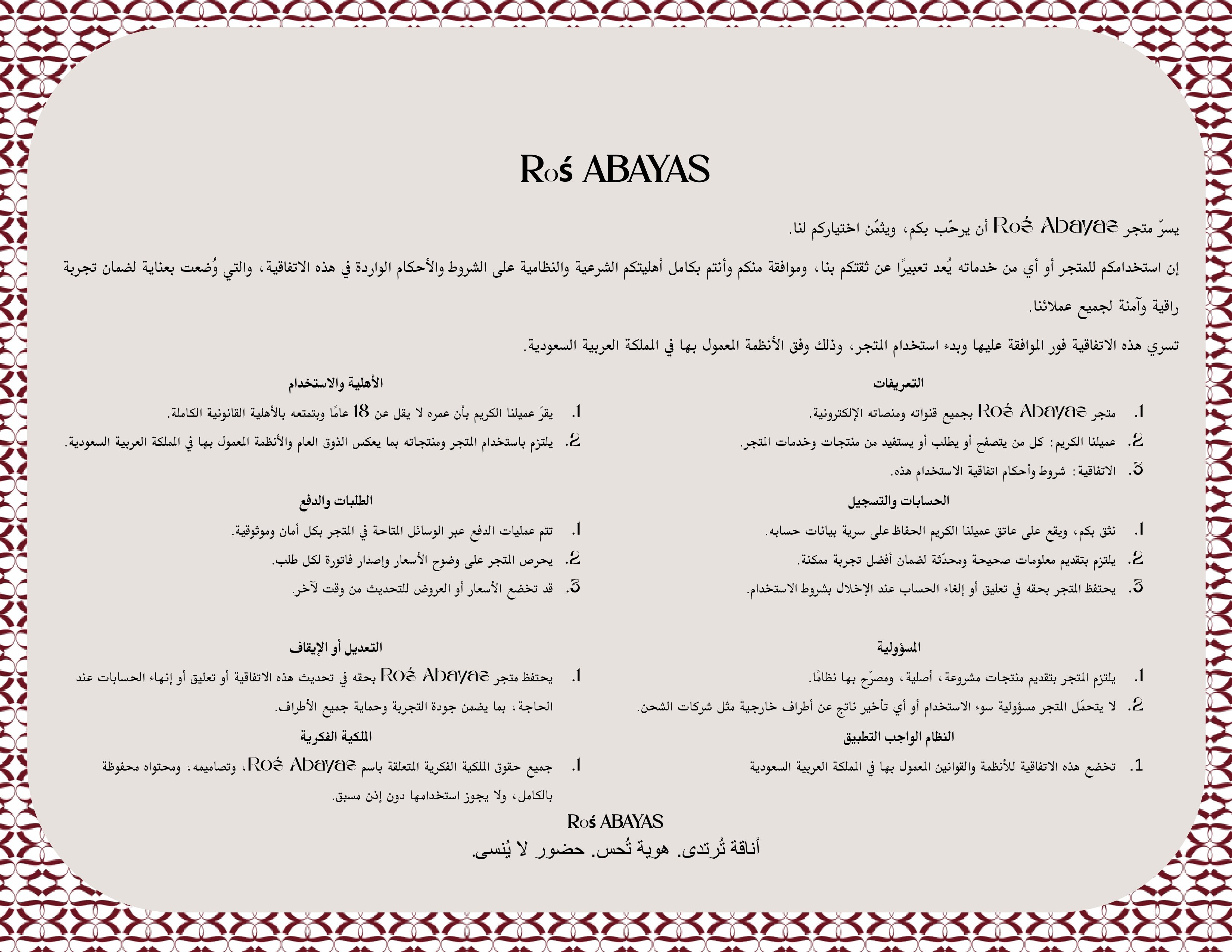 Roś Abayas offers elegant abaya designs blending tradition and modern style. Officially registered under C.R 7051540081 and verified with SBC 0000192590, ensuring customers a trusted and secure shopping experience.