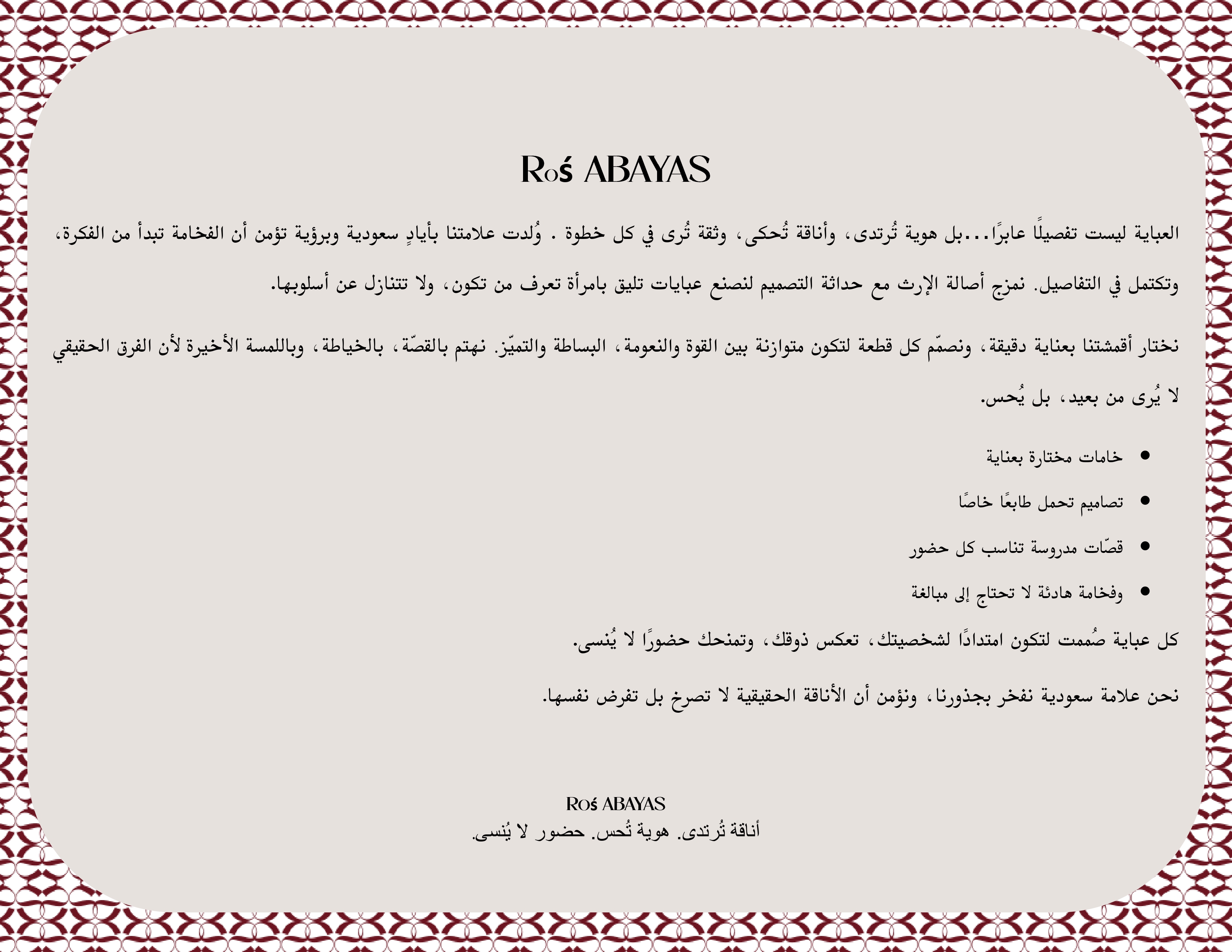 Roś Abayas offers elegant abaya designs blending tradition and modern style. Officially registered under C.R 7051540081 and verified with SBC 0000192590, ensuring customers a trusted and secure shopping experience.